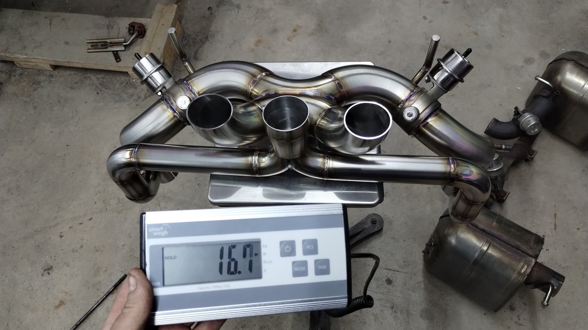 The Atlantic Built Ferrari 458 Exhaust system with valves, in 304 TIG welded stainless steel (Our heaviest configuration) weighs in at just 16.7 lbs Compared to the stock exhaust at 38.3 lbs. Removing over 21 lbs from the very rear of the vehicle.